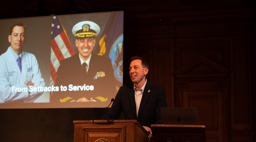 The Office of Alumni Engagement, in partnership with the Andover and the Military Committee, welcomed former U.S. Navy commander Jesse M. Ehrenfeld ’96, MD, MPH, to campus on November 10. Dr. Ehrenfeld served as the Veterans Day All-School Meeting speaker and, later that evening, as the keynote speaker for Andover’s 16th annual Veterans Day Dinner and Program. View Dr. Ehrenfeld's Veterans Day Dinner remarks.