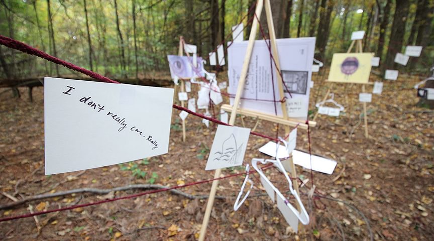 Students create temporary works in Cochran SanctuaryART600 held their annual fall exhibition in the Cochran Sanctuary October 11-13. The students were asked to use natural and/or manmade materials and objects to create a temporary piece that is in some way a response to the site and that also transforms the space to invoke or subvert a notion, perception, assumption, or situation. Some of the students were inspired by the theme of invisibility, the focus of two exhibitions on the first floor of the Addison Gallery. Other students explored the idea that all art is political.