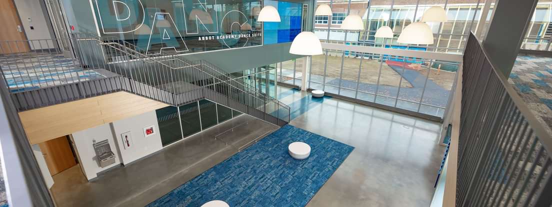 The dance suite includes a performance hall outfitted with acoustic wall panels and seating for 137, makeup and costume rooms, a green room, and a student lounge. The gift for the suite is the largest ever given by the Abbot Academy Fund, which champions projects consistent with Abbot principles and the current interests of Phillips Academy students and faculty. Of note, the main studio is named for longtime Abbot and Andover dance instructor Cristina A. Rubio P’81, GP’12, ’17.